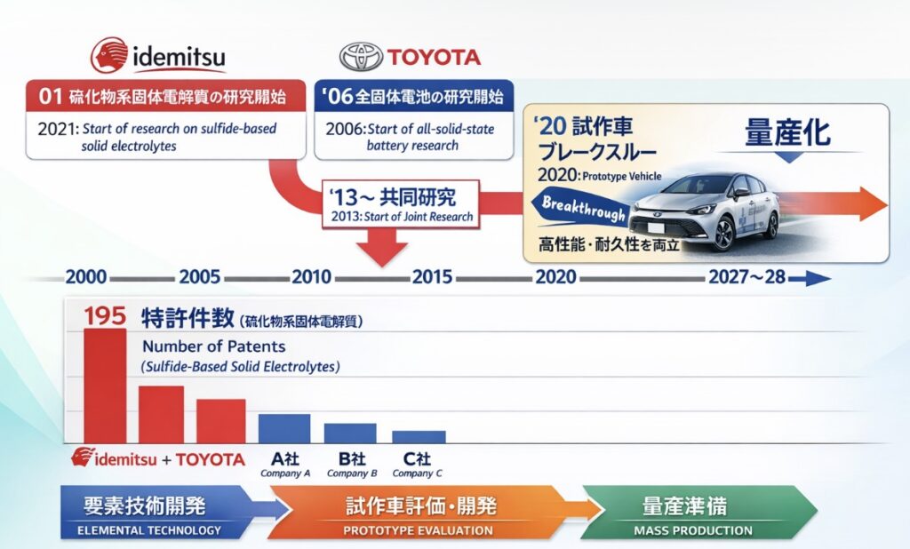 トヨタと出光興産は硫化物系固体電解質を用いた全固体電池を共同開発し、2027〜28年に全固体電池搭載BEVの投入を計画しています。