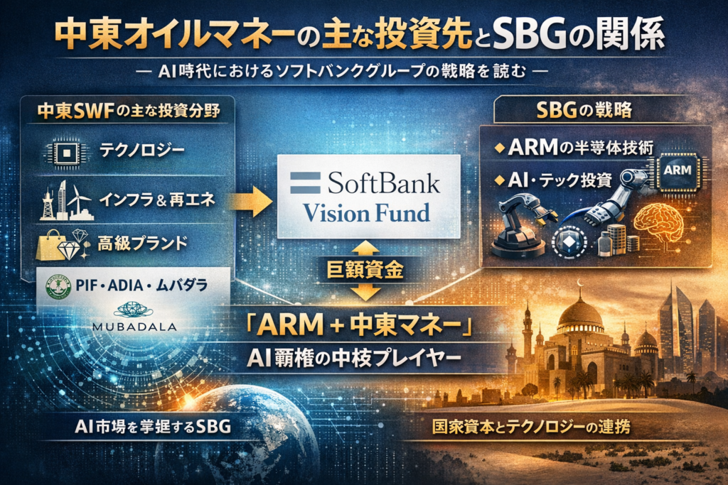 中東のオイルマネー、すなわち湾岸諸国の政府系ファンド(SWF)は、世界の資本市場において極めて大きな存在感を放っています。近年は「石油依存からの脱却」を掲げ、米国テック、欧州インフラ、再生可能エネルギー、EV、高級ブランドなどへ積極的に資金を振り向けています。その流れの中で、ソフトバンクグループ(SBG)と中東資本の結びつきは極めて重要なテーマです。
